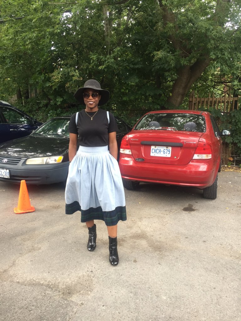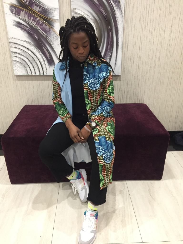 I picked up both pieces of material alongside others in one of the popular open markets in Yaounde and I was not sure what to do with them. I thought about making a custom denim jacket, but then i was like “nahh.. not visionary enough.” So the pieces sat at home for a full year and it was during my next trip home that I came up with the idea to create this skirt, and Voila! you have the finished product as you see it. I always say my seamstress is my fairy queen. She brings to life all of my designs. She is so so good!!!!